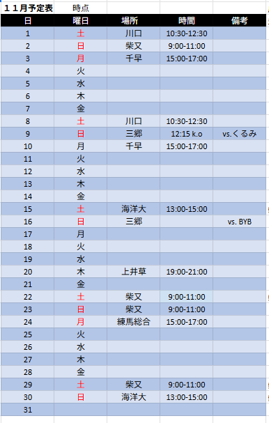 11月の活動予定になります。未定の箇所につきましては、随時更新いたします。